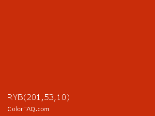 RYB 201,53,10 Color is a normal red color and the nearest color is Thunderbird #c02b18. Hex code #c92d0a and RGB value is rgb(201,45,10). In RGB color space, this color is composed of 79% red, 18% green, 4% blue, In CMYK color space, this color is composed of 0% cyan, 78% magenta, 95% yellow , 21% black , In HSL color space, this color has a hue angle of 11° , 91% saturation and 41% lightness.