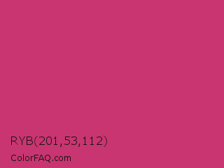 RYB 201,53,112 Color is a normal rose color and the nearest color is Telemagenta #cf3476. Hex code #c93570 and RGB value is rgb(201,53,112). In RGB color space, this color is composed of 79% red, 21% green, 44% blue, In CMYK color space, this color is composed of 0% cyan, 74% magenta, 44% yellow , 21% black , In HSL color space, this color has a hue angle of 336° , 58% saturation and 50% lightness.
