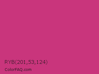 RYB 201,53,124 Color is a normal rose color and the nearest color is Fuchsia Purple #cc397b. Hex code #c9357c and RGB value is rgb(201,53,124). In RGB color space, this color is composed of 79% red, 21% green, 49% blue, In CMYK color space, this color is composed of 0% cyan, 74% magenta, 38% yellow , 21% black , In HSL color space, this color has a hue angle of 331° , 58% saturation and 50% lightness.