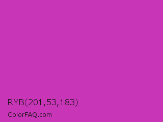 RYB 201,53,183 Color is a normal magenta color and the nearest color is Steel Pink #cc33cc. Hex code #c935b7 and RGB value is rgb(201,53,183). In RGB color space, this color is composed of 79% red, 21% green, 72% blue, In CMYK color space, this color is composed of 0% cyan, 74% magenta, 9% yellow , 21% black , In HSL color space, this color has a hue angle of 307° , 58% saturation and 50% lightness.