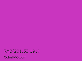 RYB 201,53,191 Color is a normal magenta color and the nearest color is Steel Pink #cc33cc. Hex code #c935bf and RGB value is rgb(201,53,191). In RGB color space, this color is composed of 79% red, 21% green, 75% blue, In CMYK color space, this color is composed of 0% cyan, 74% magenta, 5% yellow , 21% black , In HSL color space, this color has a hue angle of 304° , 58% saturation and 50% lightness.