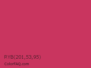 RYB 201,53,95 Color is a normal rose color and the nearest color is Dingy Dungeon #c53151. Hex code #c9355f and RGB value is rgb(201,53,95). In RGB color space, this color is composed of 79% red, 21% green, 37% blue, In CMYK color space, this color is composed of 0% cyan, 74% magenta, 53% yellow , 21% black , In HSL color space, this color has a hue angle of 343° , 58% saturation and 50% lightness.