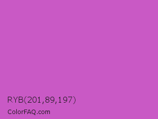 RYB 201,89,197 Color is a normal magenta color and the nearest color is Fuchsia Pink #c154c1. Hex code #c959c5 and RGB value is rgb(201,89,197). In RGB color space, this color is composed of 79% red, 35% green, 77% blue, In CMYK color space, this color is composed of 0% cyan, 56% magenta, 2% yellow , 21% black , In HSL color space, this color has a hue angle of 302° , 51% saturation and 57% lightness.