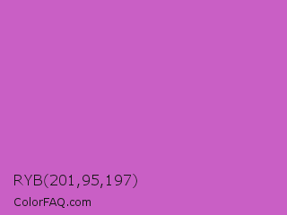 RYB 201,95,197 Color is a normal magenta color and the nearest color is Fuchsia Pink #c154c1. Hex code #c95fc5 and RGB value is rgb(201,95,197). In RGB color space, this color is composed of 79% red, 37% green, 77% blue, In CMYK color space, this color is composed of 0% cyan, 53% magenta, 2% yellow , 21% black , In HSL color space, this color has a hue angle of 302° , 50% saturation and 58% lightness.