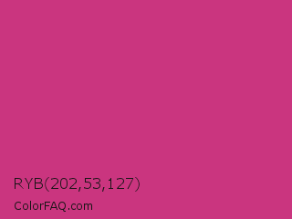 RYB 202,53,127 Color is a normal rose color and the nearest color is Fuchsia Purple #cc397b. Hex code #ca357f and RGB value is rgb(202,53,127). In RGB color space, this color is composed of 79% red, 21% green, 50% blue, In CMYK color space, this color is composed of 0% cyan, 74% magenta, 37% yellow , 21% black , In HSL color space, this color has a hue angle of 330° , 58% saturation and 50% lightness.