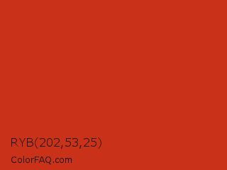 RYB 202,53,25 Color is a normal red color and the nearest color is Thunderbird #c02b18. Hex code #ca3119 and RGB value is rgb(202,49,25). In RGB color space, this color is composed of 79% red, 19% green, 10% blue, In CMYK color space, this color is composed of 0% cyan, 76% magenta, 88% yellow , 21% black , In HSL color space, this color has a hue angle of 8° , 78% saturation and 45% lightness.