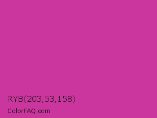 RYB 203,53,158 Color is a normal magenta color and the nearest color is Royal Fuchsia #ca2c92. Hex code #cb359e and RGB value is rgb(203,53,158). In RGB color space, this color is composed of 80% red, 21% green, 62% blue, In CMYK color space, this color is composed of 0% cyan, 74% magenta, 22% yellow , 20% black , In HSL color space, this color has a hue angle of 318° , 59% saturation and 50% lightness.