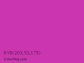RYB 203,53,175 Color is a normal magenta color and the nearest color is Byzantine #bd33a4. Hex code #cb35af and RGB value is rgb(203,53,175). In RGB color space, this color is composed of 80% red, 21% green, 69% blue, In CMYK color space, this color is composed of 0% cyan, 74% magenta, 14% yellow , 20% black , In HSL color space, this color has a hue angle of 311° , 59% saturation and 50% lightness.
