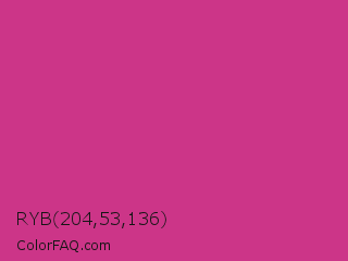 RYB 204,53,136 Color is a normal magenta color and the nearest color is Magenta Pink #cc338b. Hex code #cc3588 and RGB value is rgb(204,53,136). In RGB color space, this color is composed of 80% red, 21% green, 53% blue, In CMYK color space, this color is composed of 0% cyan, 74% magenta, 33% yellow , 20% black , In HSL color space, this color has a hue angle of 327° , 60% saturation and 50% lightness.