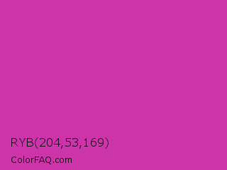 RYB 204,53,169 Color is a normal magenta color and the nearest color is Byzantine #bd33a4. Hex code #cc35a9 and RGB value is rgb(204,53,169). In RGB color space, this color is composed of 80% red, 21% green, 66% blue, In CMYK color space, this color is composed of 0% cyan, 74% magenta, 17% yellow , 20% black , In HSL color space, this color has a hue angle of 314° , 60% saturation and 50% lightness.