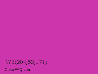 RYB 204,53,171 Color is a normal magenta color and the nearest color is Byzantine #bd33a4. Hex code #cc35ab and RGB value is rgb(204,53,171). In RGB color space, this color is composed of 80% red, 21% green, 67% blue, In CMYK color space, this color is composed of 0% cyan, 74% magenta, 16% yellow , 20% black , In HSL color space, this color has a hue angle of 313° , 60% saturation and 50% lightness.