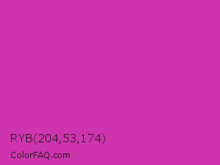 RYB 204,53,174 Color is a normal magenta color and the nearest color is Byzantine #bd33a4. Hex code #cc35ae and RGB value is rgb(204,53,174). In RGB color space, this color is composed of 80% red, 21% green, 68% blue, In CMYK color space, this color is composed of 0% cyan, 74% magenta, 15% yellow , 20% black , In HSL color space, this color has a hue angle of 312° , 60% saturation and 50% lightness.