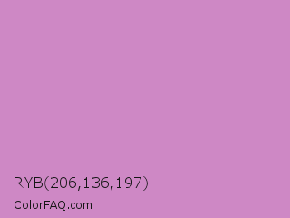 RYB 206,136,197 Color is a light magenta color and the nearest color is Pastel Violet #cb99c9. Hex code #ce88c5 and RGB value is rgb(206,136,197). In RGB color space, this color is composed of 81% red, 53% green, 77% blue, In CMYK color space, this color is composed of 0% cyan, 34% magenta, 4% yellow , 19% black , In HSL color space, this color has a hue angle of 308° , 42% saturation and 67% lightness.