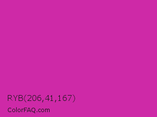 RYB 206,41,167 Color is a normal magenta color and the nearest color is Byzantine #bd33a4. Hex code #ce29a7 and RGB value is rgb(206,41,167). In RGB color space, this color is composed of 81% red, 16% green, 65% blue, In CMYK color space, this color is composed of 0% cyan, 80% magenta, 19% yellow , 19% black , In HSL color space, this color has a hue angle of 314° , 67% saturation and 48% lightness.