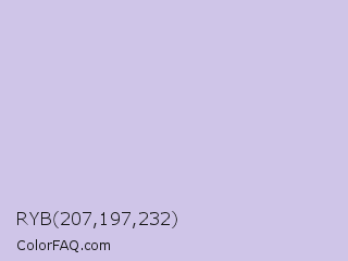 RYB 207,197,232 Color is a very light indigo color and the nearest color is Prelude #d0c0e5. Hex code #cfc5e8 and RGB value is rgb(207,197,232). In RGB color space, this color is composed of 81% red, 77% green, 91% blue, In CMYK color space, this color is composed of 11% cyan, 15% magenta, 0% yellow , 9% black , In HSL color space, this color has a hue angle of 257° , 43% saturation and 84% lightness.