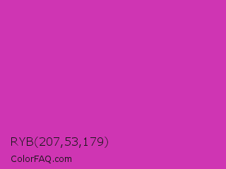 RYB 207,53,179 Color is a normal magenta color and the nearest color is Byzantine #bd33a4. Hex code #cf35b3 and RGB value is rgb(207,53,179). In RGB color space, this color is composed of 81% red, 21% green, 70% blue, In CMYK color space, this color is composed of 0% cyan, 74% magenta, 14% yellow , 19% black , In HSL color space, this color has a hue angle of 311° , 62% saturation and 51% lightness.