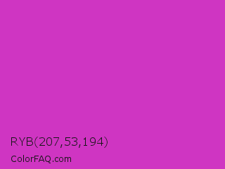 RYB 207,53,194 Color is a normal magenta color and the nearest color is Steel Pink #cc33cc. Hex code #cf35c2 and RGB value is rgb(207,53,194). In RGB color space, this color is composed of 81% red, 21% green, 76% blue, In CMYK color space, this color is composed of 0% cyan, 74% magenta, 6% yellow , 19% black , In HSL color space, this color has a hue angle of 305° , 62% saturation and 51% lightness.