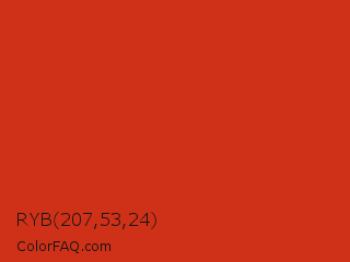RYB 207,53,24 Color is a normal red color and the nearest color is Vermilion #d9381e. Hex code #cf3118 and RGB value is rgb(207,49,24). In RGB color space, this color is composed of 81% red, 19% green, 9% blue, In CMYK color space, this color is composed of 0% cyan, 76% magenta, 88% yellow , 19% black , In HSL color space, this color has a hue angle of 8° , 79% saturation and 45% lightness.
