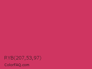 RYB 207,53,97 Color is a normal rose color and the nearest color is Cerise Red #de3163. Hex code #cf3561 and RGB value is rgb(207,53,97). In RGB color space, this color is composed of 81% red, 21% green, 38% blue, In CMYK color space, this color is composed of 0% cyan, 74% magenta, 53% yellow , 19% black , In HSL color space, this color has a hue angle of 343° , 62% saturation and 51% lightness.