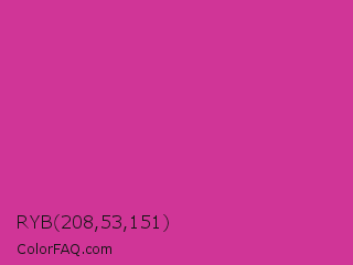 RYB 208,53,151 Color is a normal magenta color and the nearest color is Royal Fuchsia #ca2c92. Hex code #d03597 and RGB value is rgb(208,53,151). In RGB color space, this color is composed of 82% red, 21% green, 59% blue, In CMYK color space, this color is composed of 0% cyan, 75% magenta, 27% yellow , 18% black , In HSL color space, this color has a hue angle of 322° , 62% saturation and 51% lightness.