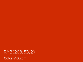 RYB 208,53,2 Color is a normal red color and the nearest color is Sinopia #cb410b. Hex code #d02b02 and RGB value is rgb(208,43,2). In RGB color space, this color is composed of 82% red, 17% green, 1% blue, In CMYK color space, this color is composed of 0% cyan, 79% magenta, 99% yellow , 18% black , In HSL color space, this color has a hue angle of 12° , 98% saturation and 41% lightness.