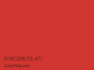 RYB 208,53,47 Color is a normal red color and the nearest color is Persian Red #cc3333. Hex code #d0352f and RGB value is rgb(208,53,47). In RGB color space, this color is composed of 82% red, 21% green, 18% blue, In CMYK color space, this color is composed of 0% cyan, 75% magenta, 77% yellow , 18% black , In HSL color space, this color has a hue angle of 2° , 63% saturation and 50% lightness.