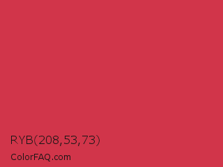 RYB 208,53,73 Color is a normal red color and the nearest color is French Raspberry #c72c48. Hex code #d03549 and RGB value is rgb(208,53,73). In RGB color space, this color is composed of 82% red, 21% green, 29% blue, In CMYK color space, this color is composed of 0% cyan, 75% magenta, 65% yellow , 18% black , In HSL color space, this color has a hue angle of 352° , 62% saturation and 51% lightness.