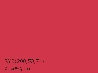 RYB 208,53,74 Color is a normal red color and the nearest color is French Raspberry #c72c48. Hex code #d0354a and RGB value is rgb(208,53,74). In RGB color space, this color is composed of 82% red, 21% green, 29% blue, In CMYK color space, this color is composed of 0% cyan, 75% magenta, 64% yellow , 18% black , In HSL color space, this color has a hue angle of 352° , 62% saturation and 51% lightness.