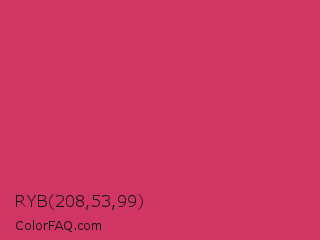 RYB 208,53,99 Color is a normal rose color and the nearest color is Cerise Red #de3163. Hex code #d03563 and RGB value is rgb(208,53,99). In RGB color space, this color is composed of 82% red, 21% green, 39% blue, In CMYK color space, this color is composed of 0% cyan, 75% magenta, 52% yellow , 18% black , In HSL color space, this color has a hue angle of 342° , 62% saturation and 51% lightness.