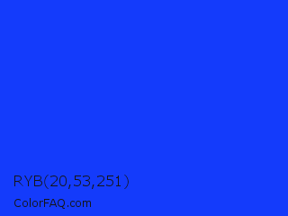 RYB 20,53,251 Color is a normal blue color and the nearest color is Blue RYB #0247fe. Hex code #143bfb and RGB value is rgb(20,59,251). In RGB color space, this color is composed of 8% red, 23% green, 98% blue, In CMYK color space, this color is composed of 92% cyan, 76% magenta, 0% yellow , 2% black , In HSL color space, this color has a hue angle of 230° , 97% saturation and 53% lightness.