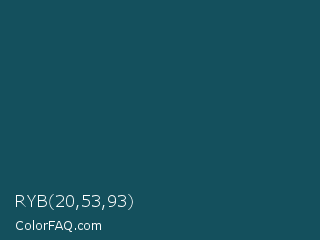 RYB 20,53,93 Color is a very dark cyan color and the nearest color is Eden #105852. Hex code #14505d and RGB value is rgb(20,80,93). In RGB color space, this color is composed of 8% red, 31% green, 36% blue, In CMYK color space, this color is composed of 78% cyan, 14% magenta, 0% yellow , 64% black , In HSL color space, this color has a hue angle of 191° , 65% saturation and 22% lightness.