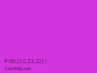 RYB 210,53,221 Color is a normal magenta color and the nearest color is Steel Pink #cc33cc. Hex code #d235dd and RGB value is rgb(210,53,221). In RGB color space, this color is composed of 82% red, 21% green, 87% blue, In CMYK color space, this color is composed of 5% cyan, 76% magenta, 0% yellow , 13% black , In HSL color space, this color has a hue angle of 296° , 71% saturation and 54% lightness.
