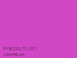 RYB 210,71,197 Color is a normal magenta color and the nearest color is Fuchsia Pink #c154c1. Hex code #d247c5 and RGB value is rgb(210,71,197). In RGB color space, this color is composed of 82% red, 28% green, 77% blue, In CMYK color space, this color is composed of 0% cyan, 66% magenta, 6% yellow , 18% black , In HSL color space, this color has a hue angle of 306° , 61% saturation and 55% lightness.