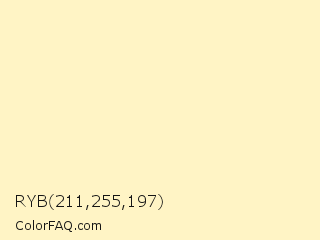 RYB 211,255,197 Color is a very light yellow color and the nearest color is Beeswax #fef2c7. Hex code #fff4c5 and RGB value is rgb(255,244,197). In RGB color space, this color is composed of 100% red, 96% green, 77% blue, In CMYK color space, this color is composed of 0% cyan, 4% magenta, 23% yellow , 0% black , In HSL color space, this color has a hue angle of 49° , 100% saturation and 89% lightness.