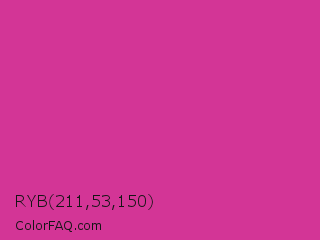 RYB 211,53,150 Color is a normal magenta color and the nearest color is Magenta Pink #cc338b. Hex code #d33596 and RGB value is rgb(211,53,150). In RGB color space, this color is composed of 83% red, 21% green, 59% blue, In CMYK color space, this color is composed of 0% cyan, 75% magenta, 29% yellow , 17% black , In HSL color space, this color has a hue angle of 323° , 64% saturation and 52% lightness.