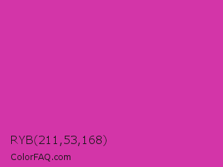 RYB 211,53,168 Color is a normal magenta color and the nearest color is Frostbite #e936a7. Hex code #d335a8 and RGB value is rgb(211,53,168). In RGB color space, this color is composed of 83% red, 21% green, 66% blue, In CMYK color space, this color is composed of 0% cyan, 75% magenta, 20% yellow , 17% black , In HSL color space, this color has a hue angle of 316° , 64% saturation and 52% lightness.