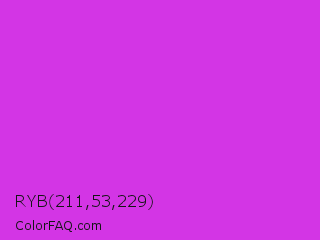 RYB 211,53,229 Color is a normal magenta color and the nearest color is Steel Pink #cc33cc. Hex code #d335e5 and RGB value is rgb(211,53,229). In RGB color space, this color is composed of 83% red, 21% green, 90% blue, In CMYK color space, this color is composed of 8% cyan, 77% magenta, 0% yellow , 10% black , In HSL color space, this color has a hue angle of 294° , 77% saturation and 55% lightness.