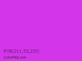 RYB 211,53,235 Color is a normal magenta color and the nearest color is Steel Pink #cc33cc. Hex code #d335eb and RGB value is rgb(211,53,235). In RGB color space, this color is composed of 83% red, 21% green, 92% blue, In CMYK color space, this color is composed of 10% cyan, 77% magenta, 0% yellow , 8% black , In HSL color space, this color has a hue angle of 292° , 82% saturation and 56% lightness.