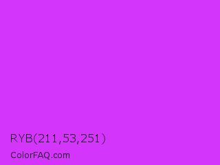 RYB 211,53,251 Color is a normal purple color and the nearest color is Steel Pink #cc33cc. Hex code #d335fb and RGB value is rgb(211,53,251). In RGB color space, this color is composed of 83% red, 21% green, 98% blue, In CMYK color space, this color is composed of 16% cyan, 79% magenta, 0% yellow , 2% black , In HSL color space, this color has a hue angle of 288° , 96% saturation and 60% lightness.