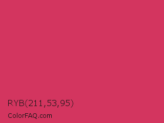 RYB 211,53,95 Color is a normal rose color and the nearest color is Cerise Red #de3163. Hex code #d3355f and RGB value is rgb(211,53,95). In RGB color space, this color is composed of 83% red, 21% green, 37% blue, In CMYK color space, this color is composed of 0% cyan, 75% magenta, 55% yellow , 17% black , In HSL color space, this color has a hue angle of 344° , 64% saturation and 52% lightness.