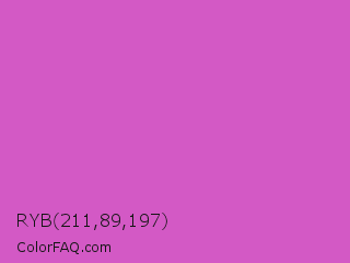 RYB 211,89,197 Color is a normal magenta color and the nearest color is Fuchsia Pink #c154c1. Hex code #d359c5 and RGB value is rgb(211,89,197). In RGB color space, this color is composed of 83% red, 35% green, 77% blue, In CMYK color space, this color is composed of 0% cyan, 58% magenta, 7% yellow , 17% black , In HSL color space, this color has a hue angle of 307° , 58% saturation and 59% lightness.