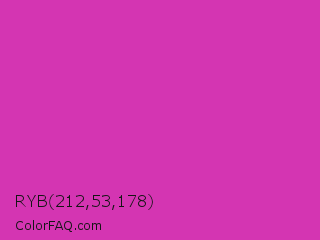 RYB 212,53,178 Color is a normal magenta color and the nearest color is Frostbite #e936a7. Hex code #d435b2 and RGB value is rgb(212,53,178). In RGB color space, this color is composed of 83% red, 21% green, 70% blue, In CMYK color space, this color is composed of 0% cyan, 75% magenta, 16% yellow , 17% black , In HSL color space, this color has a hue angle of 313° , 65% saturation and 52% lightness.