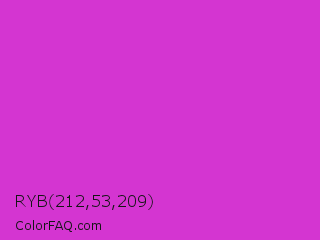 RYB 212,53,209 Color is a normal magenta color and the nearest color is Steel Pink #cc33cc. Hex code #d435d1 and RGB value is rgb(212,53,209). In RGB color space, this color is composed of 83% red, 21% green, 82% blue, In CMYK color space, this color is composed of 0% cyan, 75% magenta, 1% yellow , 17% black , In HSL color space, this color has a hue angle of 301° , 65% saturation and 52% lightness.