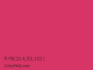 RYB 214,53,101 Color is a normal rose color and the nearest color is Cerise Red #de3163. Hex code #d63565 and RGB value is rgb(214,53,101). In RGB color space, this color is composed of 84% red, 21% green, 40% blue, In CMYK color space, this color is composed of 0% cyan, 75% magenta, 53% yellow , 16% black , In HSL color space, this color has a hue angle of 342° , 66% saturation and 52% lightness.