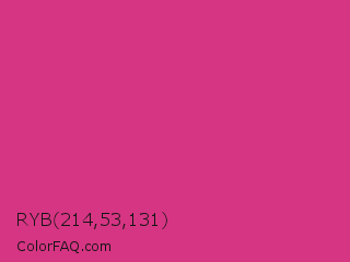 RYB 214,53,131 Color is a normal rose color and the nearest color is Cerise #da3287. Hex code #d63583 and RGB value is rgb(214,53,131). In RGB color space, this color is composed of 84% red, 21% green, 51% blue, In CMYK color space, this color is composed of 0% cyan, 75% magenta, 39% yellow , 16% black , In HSL color space, this color has a hue angle of 331° , 66% saturation and 52% lightness.