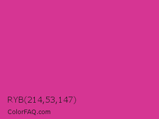 RYB 214,53,147 Color is a normal magenta color and the nearest color is Magenta Pink #cc338b. Hex code #d63593 and RGB value is rgb(214,53,147). In RGB color space, this color is composed of 84% red, 21% green, 58% blue, In CMYK color space, this color is composed of 0% cyan, 75% magenta, 31% yellow , 16% black , In HSL color space, this color has a hue angle of 325° , 66% saturation and 52% lightness.