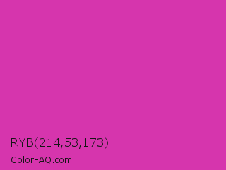 RYB 214,53,173 Color is a normal magenta color and the nearest color is Frostbite #e936a7. Hex code #d635ad and RGB value is rgb(214,53,173). In RGB color space, this color is composed of 84% red, 21% green, 68% blue, In CMYK color space, this color is composed of 0% cyan, 75% magenta, 19% yellow , 16% black , In HSL color space, this color has a hue angle of 315° , 66% saturation and 52% lightness.
