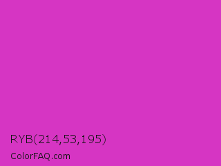 RYB 214,53,195 Color is a normal magenta color and the nearest color is Steel Pink #cc33cc. Hex code #d635c3 and RGB value is rgb(214,53,195). In RGB color space, this color is composed of 84% red, 21% green, 76% blue, In CMYK color space, this color is composed of 0% cyan, 75% magenta, 9% yellow , 16% black , In HSL color space, this color has a hue angle of 307° , 66% saturation and 52% lightness.