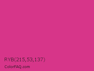 RYB 215,53,137 Color is a normal rose color and the nearest color is Cerise #da3287. Hex code #d73589 and RGB value is rgb(215,53,137). In RGB color space, this color is composed of 84% red, 21% green, 54% blue, In CMYK color space, this color is composed of 0% cyan, 75% magenta, 36% yellow , 16% black , In HSL color space, this color has a hue angle of 329° , 67% saturation and 53% lightness.