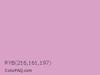 RYB 216,161,197 Color is a light magenta color and the nearest color is Light Medium Orchid #d39bcb. Hex code #d8a1c5 and RGB value is rgb(216,161,197). In RGB color space, this color is composed of 85% red, 63% green, 77% blue, In CMYK color space, this color is composed of 0% cyan, 25% magenta, 9% yellow , 15% black , In HSL color space, this color has a hue angle of 321° , 41% saturation and 74% lightness.